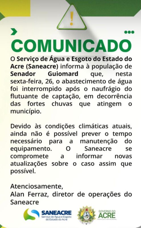 O Saneacre informou que equipes técnicas acompanham a situação e que o órgão se compromete a divulgar novas atualizações assim que houver avanço nos serviços ou melhora no tempo.