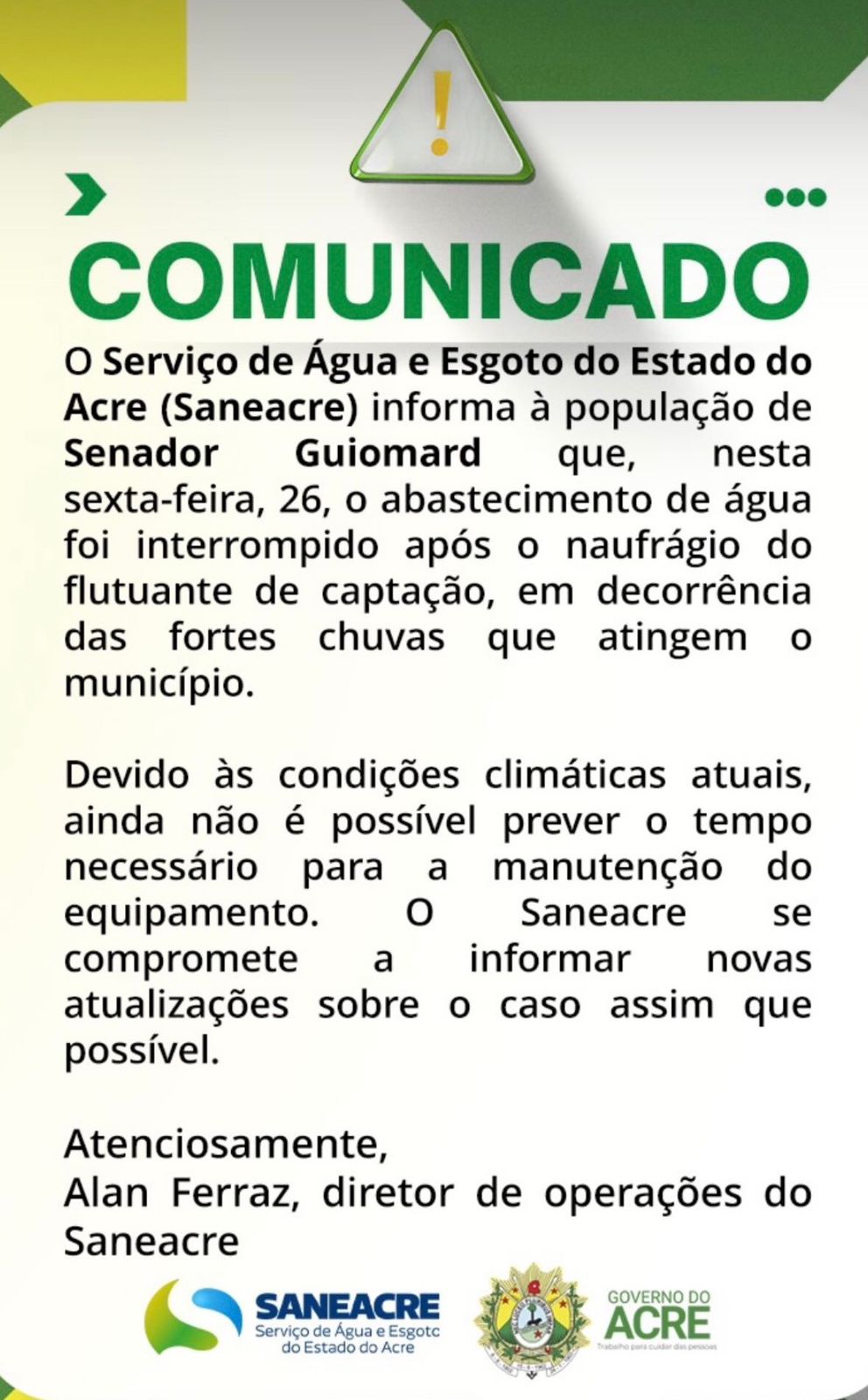 O município de Senador Guiomard amanheceu sem abastecimento de água após o naufrágio do flutuante de captação, ocorrido em decorrência das fortes chuvas que atingem a região nos últimos dias.