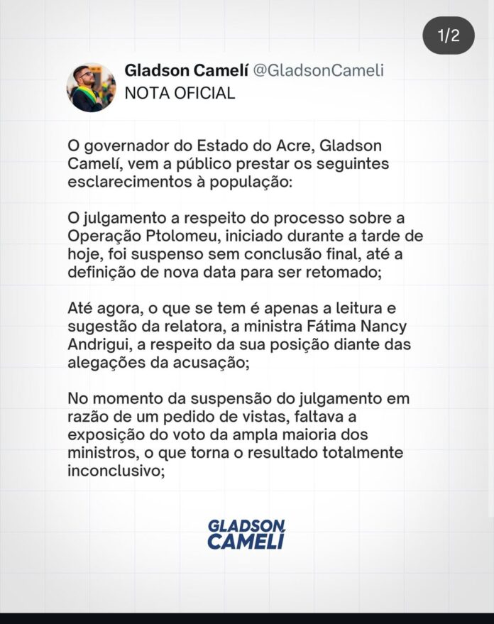 O governador do Estado do Acre, Gladson Camelí, vem a público prestar os seguintes esclarecimentos à população:
