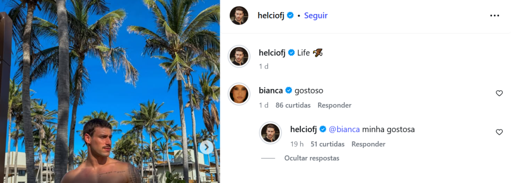 Na última foto publicada no feed por Feijó, ele aparece sem camisa em Fortaleza. Bianca Andrade comentou: “Gostoso”. Ele, por sua vez, respondeu: “Minha gostosa”.