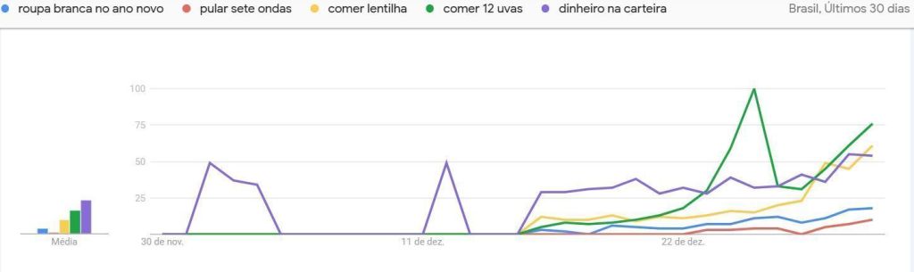 Os termos buscados no levantamento de comparação foram “roupa branca no ano novo”, “pular sete ondas”, “comer lentilha”, “comer 12 uvas” e “dinheiro na carteira”. O gráfico dos últimos 30 dias mostra que a movimentação das pesquisas começou no dia 15 de dezembro deste mês.