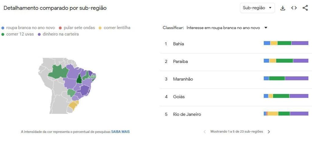 A plataforma também mostra o gráfico de interesse pelas superstições de acordo com as sub-regiões do Brasil. Na maioria dos estados como, por exemplo, Bahia, Paraíba, Maranhão, Goiás e Rio de Janeiro, a tradição de colocar “dinheiro na carteira” foi a mais pesquisada.