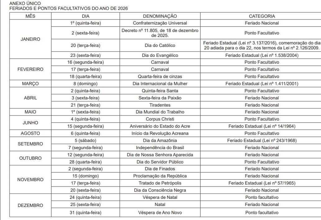 O governo do Estado do Acre divulgou nesta segunda-feira, 22, por meio do Decreto nº 11.809, publicado na edição extra do Diário Oficial do Estado (DOE), o calendário oficial de feriados e pontos facultativos para o ano de 2026 (confira abaixo). O documento regula o funcionamento dos órgãos e entidades do Poder Executivo estadual, com exceção dos serviços considerados essenciais.