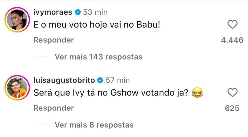 Entre as reações, Ivy Moraes, do BBB 20, comentou de forma bem-humorada sobre a volta de Babu Santana, seu colega de edição. “E o meu voto hoje vai no Babu”, escreveu a ex-sister, em referência aos memes e situações icônicas da temporada.