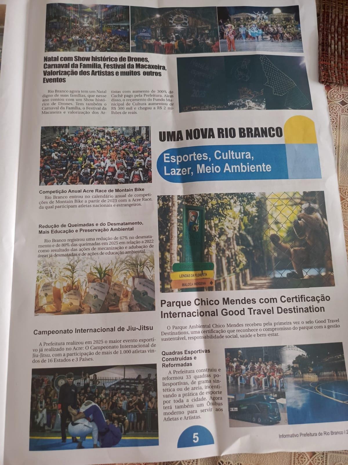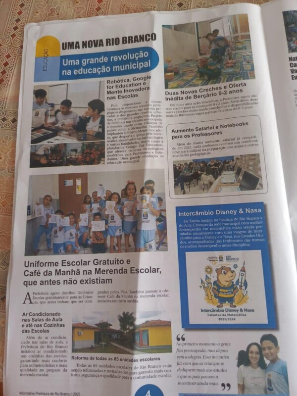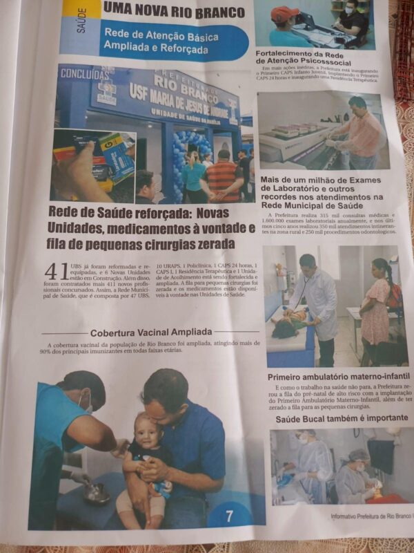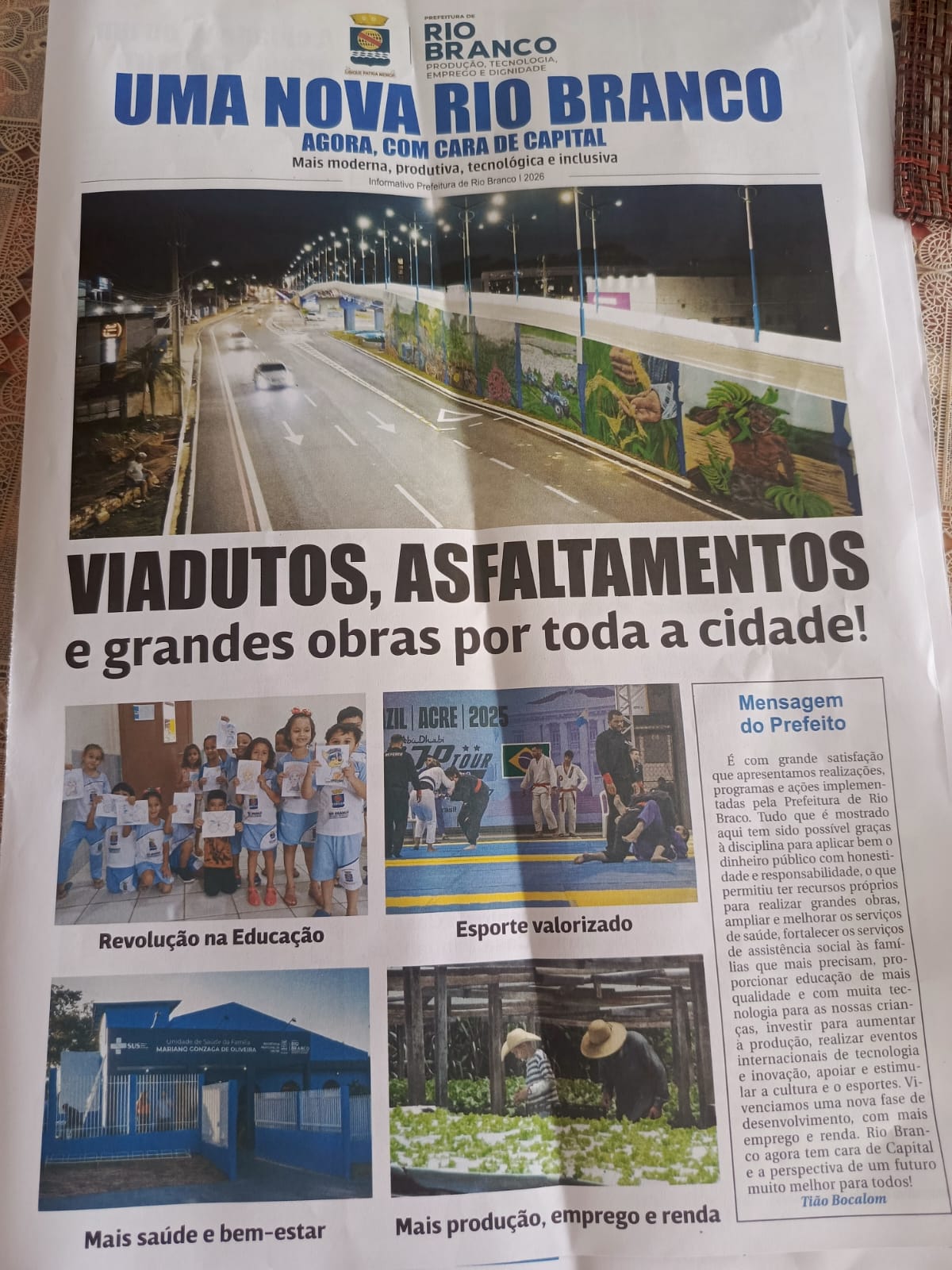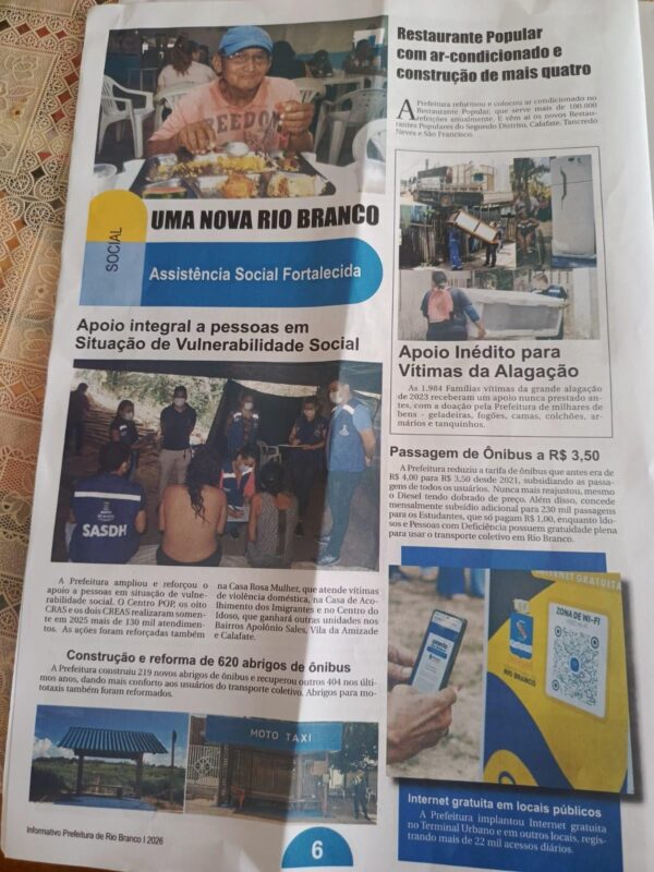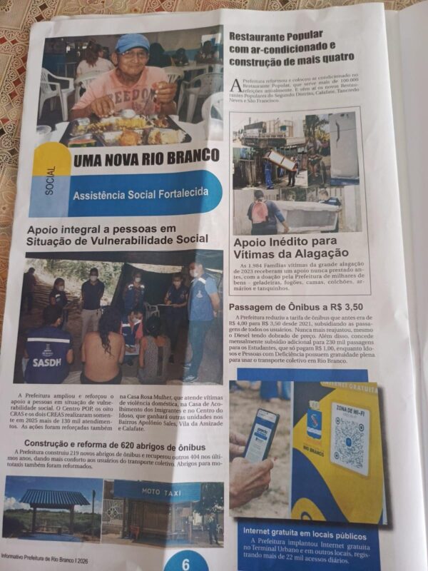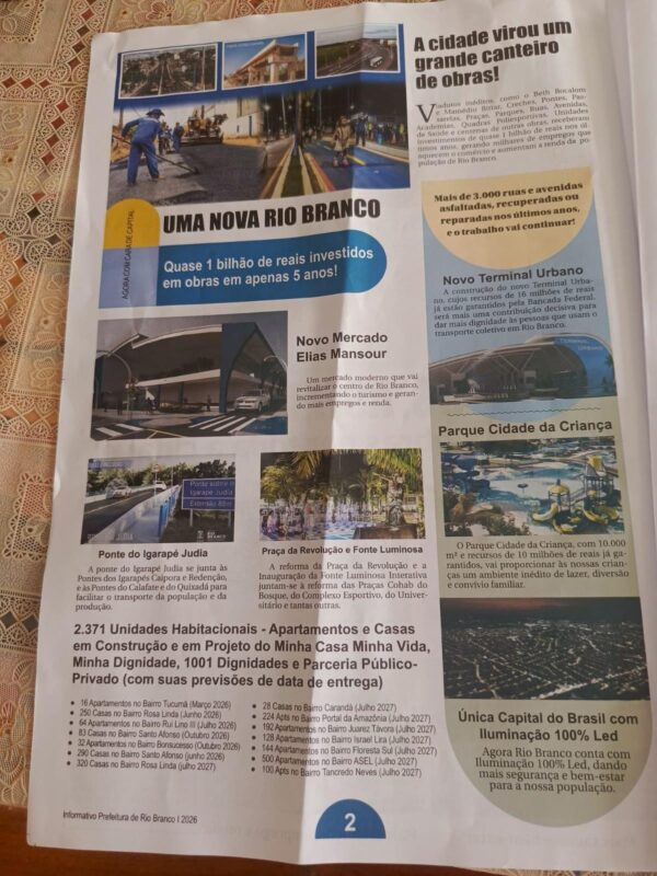 A peça de 8 páginas, intitulada “Uma Nova Rio Branco”, trás como manchete “Viadutos (no plural), asfaltamentos e grandes obras por toda a cidade”.