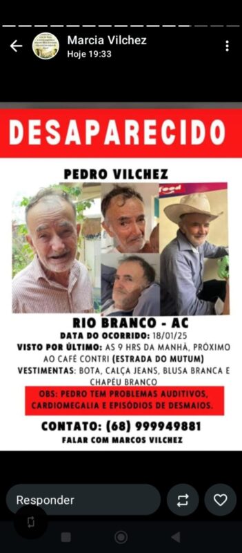 O idoso, que mora em Boca do Acre e estava na capital acreana a tratamento de saúde, foi visto por familiares pela última vez no domingo, 18, quando saiu da casa do filho na região do Alto Alegre para comprar um refrigerante.