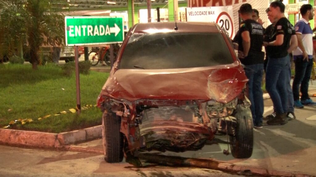 O Onix conduzido por Alan Martins, depois de atingir marido e mulher, bateu em um poste de energia elétrica e ficou parcialmente destruído.