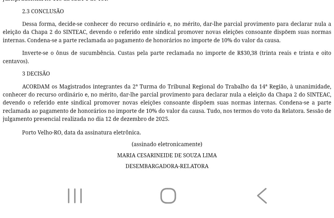A Justiça, atraves da 2° Turma do Tribunal Regional do Trabalho (TRT), decidiu, por unanimidade, pela anulação da eleição da Chapa 2 do SINTEAC, encabeçada por Rosana Nascimento, em razão de irregularidades no processo eleitoral. Trata-se de uma decisão judicial clara, que invalida o resultado da eleição e retira qualquer legitimidade do mandato da professora reeleita.