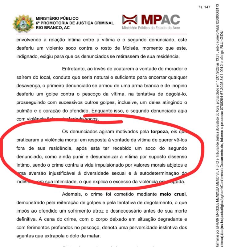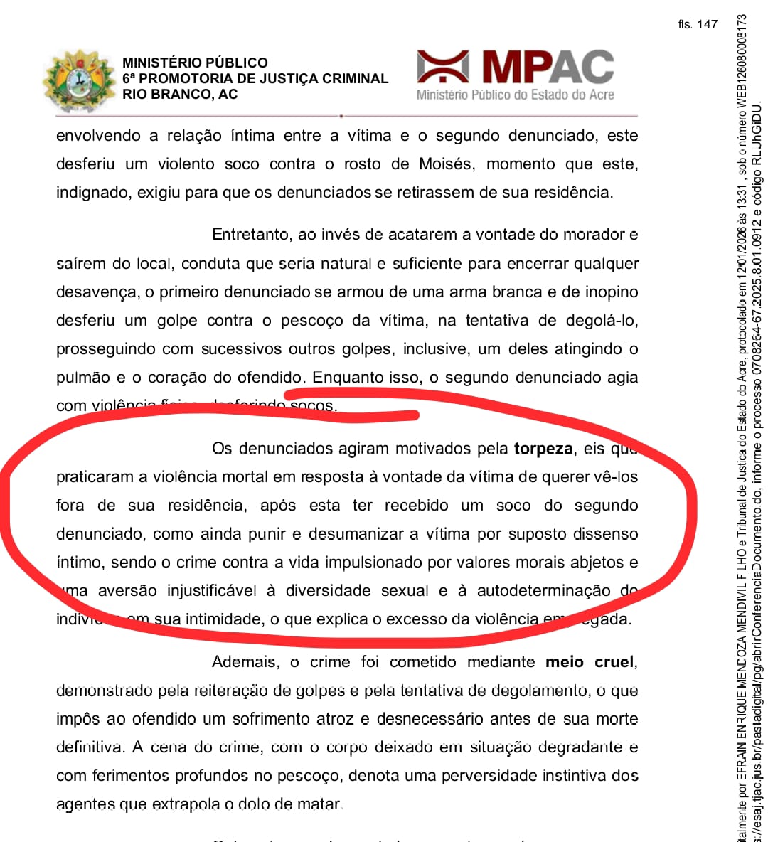 “Os dois autores do assassinato do Moisés foram denunciados pelo Ministério Público por homicídio qualificado pelo motivo torpe. E o motivo torpe, neste caso, é a homofobia, insistiu a procuradora-chefe em exercício, Patrícia Rêgo.