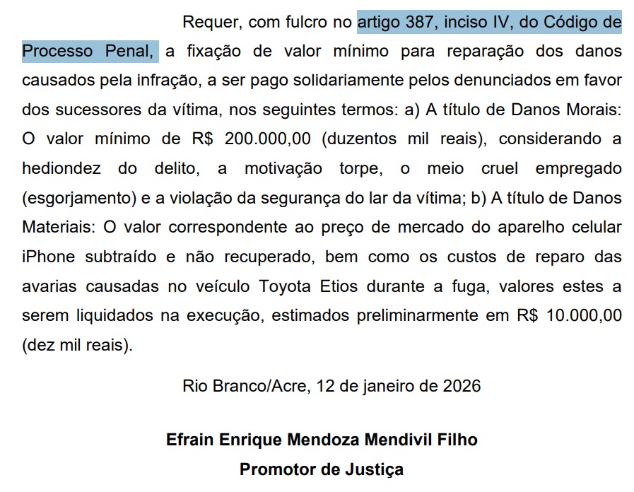 A denúncia do MP cita apenas o Código de Processo penal (veja acima) para sugerir ao juiz o ressarcimento por danos moral e material à família de Moisés Alencastro.