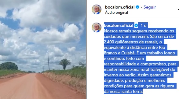 “Nossos ramais seguem recebendo os cuidados que merecem. São cerca de 2.400 quilômetros de ramais, o equivalente à distância entre Rio Branco e Cuiabá”, diz o prefeito de Rio Branco, Tião Bocalom, em seu perfil pessoal no Instagram. No vídeo acima, Bocalom percorre de carro o Ramal Jarinal, na Transacreana, que, na verdade, foi recuperado pelo Governo do Estado, por meio do Departamento de Estradas de Rodagem do Acre (Deracre), como mostram as placas sinalizadoras e as máquinas no trecho. Trata-se de uma antiga reivindicação de quase cem famílias da região, seguindo determinação do governador Gladson Camelí.