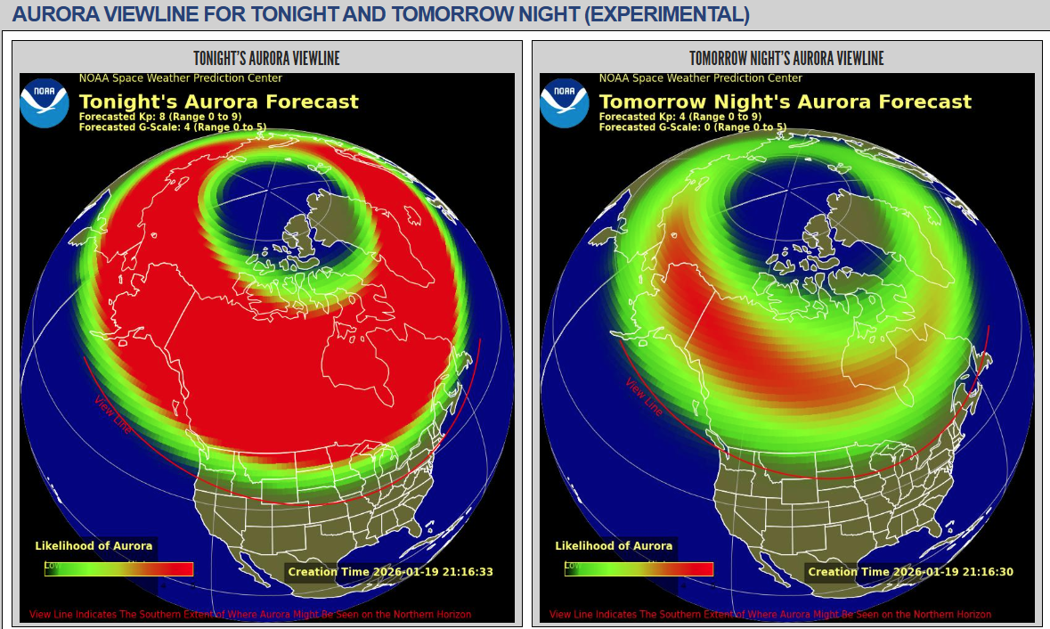 Os dois mapas mostram a aurora boreal e a linha de visão para esta noite e amanhã à noite. O brilho e a localização da aurora são geralmente representados por um oval verde centrado no polo magnético da Terra. Os ovais verdes ficam vermelhos quando a previsão é de maior intensidade da aurora.