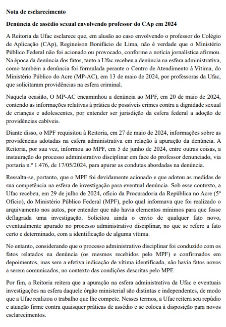 A Ufac, em resposta a uma cobrança feita por oseringal, emitiu nota de esclarecimento (leia acima) há pouco, informando ter dado ciência do desligamento do professor ao Ministério Público Federal (MPF), ao qual caberia denunciar Reginelson à justiça. Porém, a Procuradoria da República no Acre decidiu pelo arquivamento, sob a alegação de que “não há elementos mínimos para que fosse deflagrada uma investigação”.