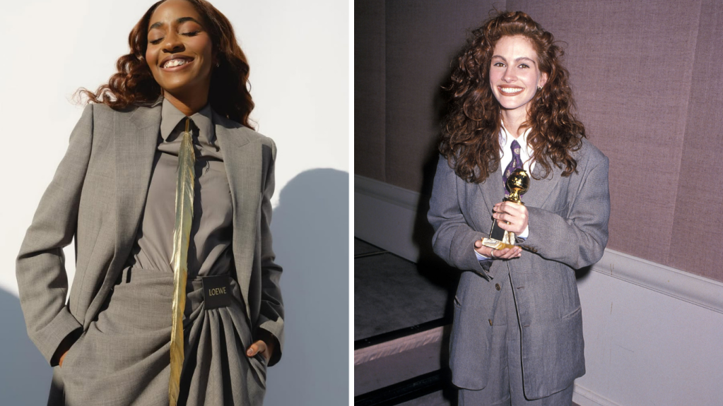 Ela revisitou a referência novamente em outubro passado, quando apareceu no “The Late Show with Stephen Colbert” para promover seu novo filme “After the Hunt”, pelo qual está mais uma vez indicada ao Globo de Ouro (desta vez para Melhor Atriz em Filme de Drama). Para a ocasião, Roberts escolheu um terno cinza-cobalto ajustado com uma gravata azul que remetia ao original – atualizado desta vez com proporções mais finas e alfaiataria contemporânea. O blazer estava mais curto e preciso, e as calças de cintura alta com corte limpo.