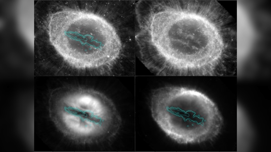 8 de 9Descobertas de 2026 (8) – Uma equipe internacional de astrônomos revelou a descoberta de uma estrutura inédita de ferro ionizado no interior da Nebulosa do Anel. Os cientistas detectaram a “barra” estreita que emite luz especificamente através de átomos de ferro • Telescópio Espacial James Webb