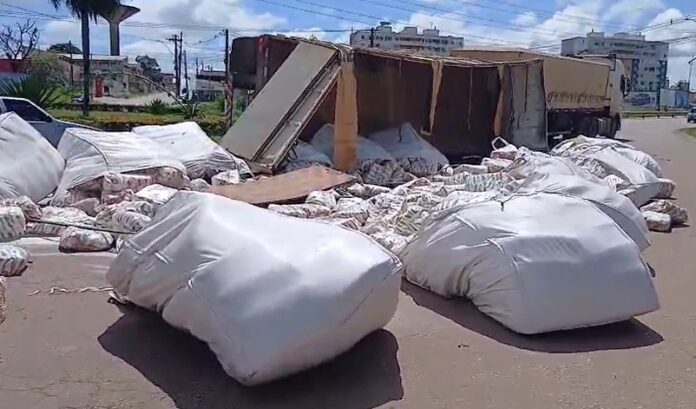 Parte de uma carreta rodotren que transportava uma carga de açúcar tombou na Via Verde, em Rio Branco, na rotatória da Havan, na manhã desta terça-feira.