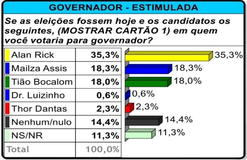 Força na Espontânea: Um dado vital para o governo é a pesquisa espontânea. Nela, Mailza (5,4%) já supera Bocalom (3,1%) e encosta no líder Alan Rick (6,9%). Isso sugere que o voto de Mailza está mais “cristalizado” ou consolidado na mente do eleitor no momento.