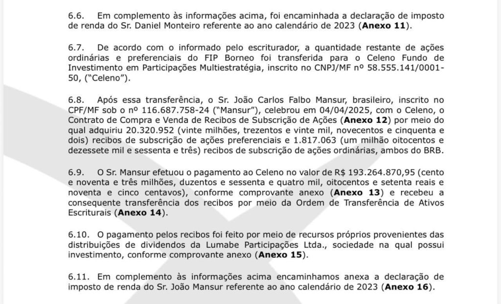 O BRB relata que, em 04 de abril de 2025, Mansur adquiriu por meio do Celeno 20.320.952 em recibos de ações preferenciais e 1.817.063 de ações ordinárias.