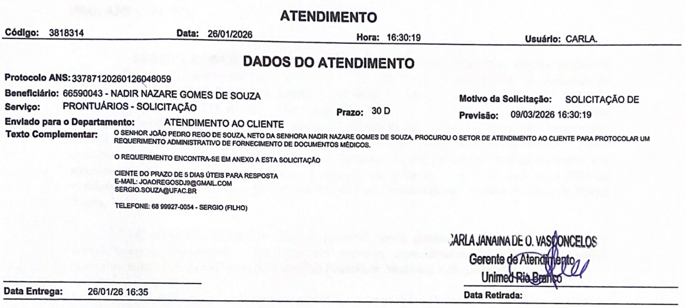 Um pedido de informações foi protocolado no dia 26 de janeiro (veja acima), com a promessa de que em cinco dias úteis ao menos o prontuário da paciente deveria ser fornecido. Nesta segunda-feira, após duas semanas de silêncio da Unimed, familiares decidiram expor na imprensa o que considera omissão e desrespeito