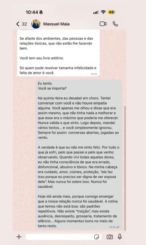 O prefeito utilizou canais diretos e declarações públicas para desabafar sobre o fim de seu relacionamento. Em tom de revolta, ele acusou a ex-esposa de manter um relacionamento extraconjugal com o promotor de justiça da cidade.