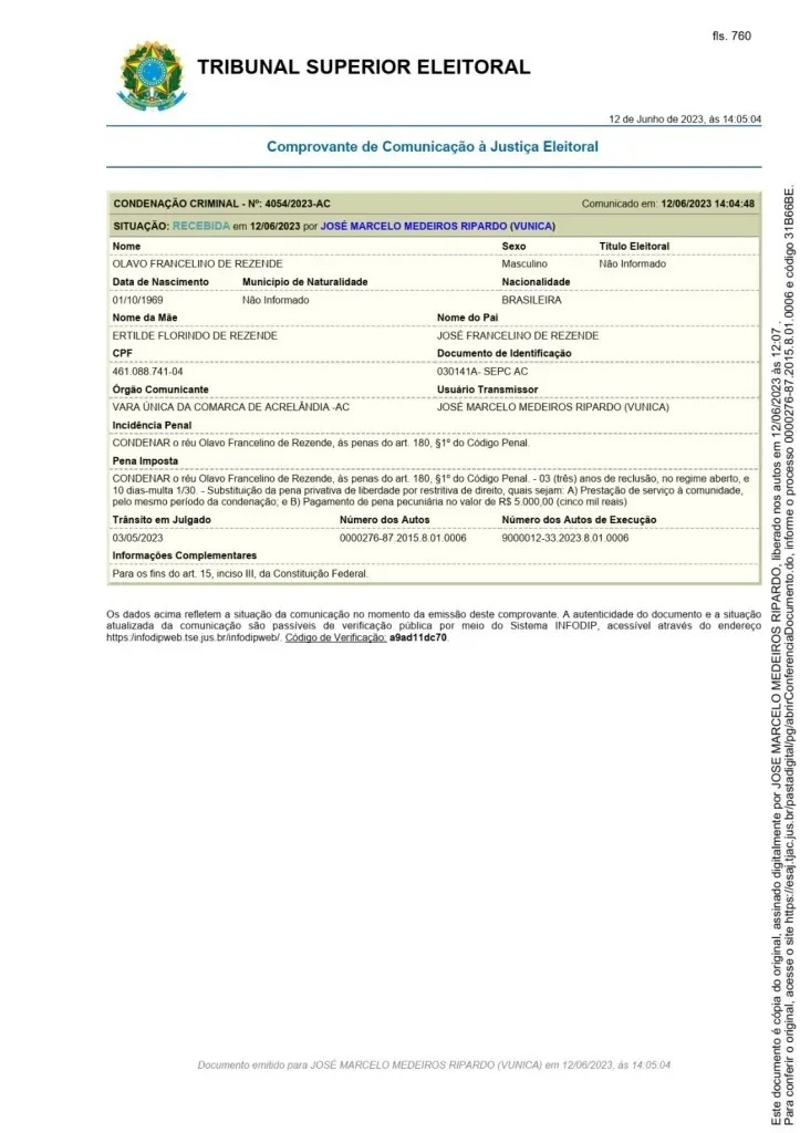 Olavinho reverteu sua situação eleitoral após ter direitos políticos cassados pelo TSE. Ele foi condenado por receptação de gado, rime que ocorreu no ano de 2014