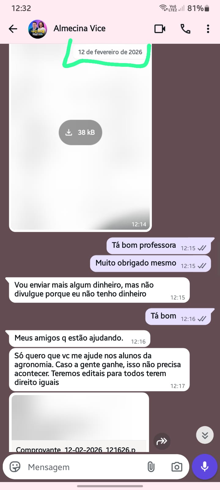 às vésperas da eleição para a reitoria da Universidade Federal do Acre, uma série de comprovantes de transferências via PIX vazados à reportagem levanta suspeitas de compra de votos envolvendo integrantes de uma das chapas concorrentes. Os registros indicam que a candidata a vice-reitora, professora Almecinda Balbino Ferreira, realizou repasses financeiros diretamente a estudantes ao mesmo tempo em que solicitava apoio. De acordo com os prints analisados (confira acima), as transferências foram feitas para contas pessoais de alunos, sem qualquer indicação formal de vínculo com programas institucionais de assistência estudantil. Em uma das conversas, após efetuar um dos envios, a candidata afirma: “Só quero que você me ajude com os alunos de agronomia. Caso a gente ganhe, isso não precisa acontecer. Teremos editais para que todos tenham direitos iguais.” O processo eleitoral foi aberto no dia 30 de janeiro e, portanto, as eleições já estavam em curso quando os pagamentos foram feitos.