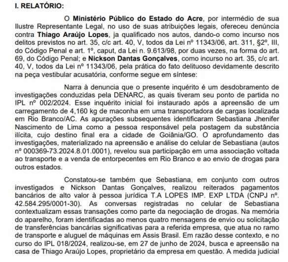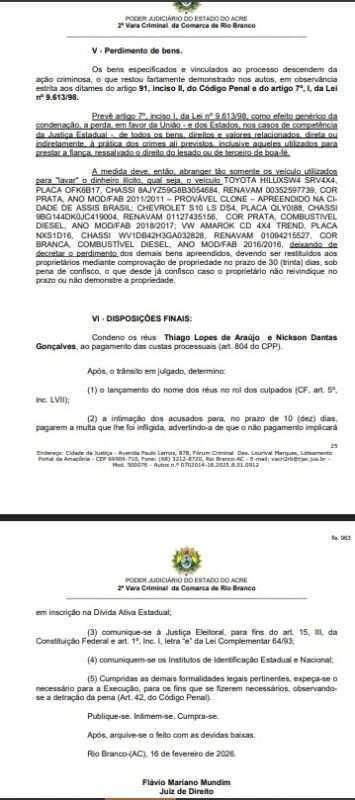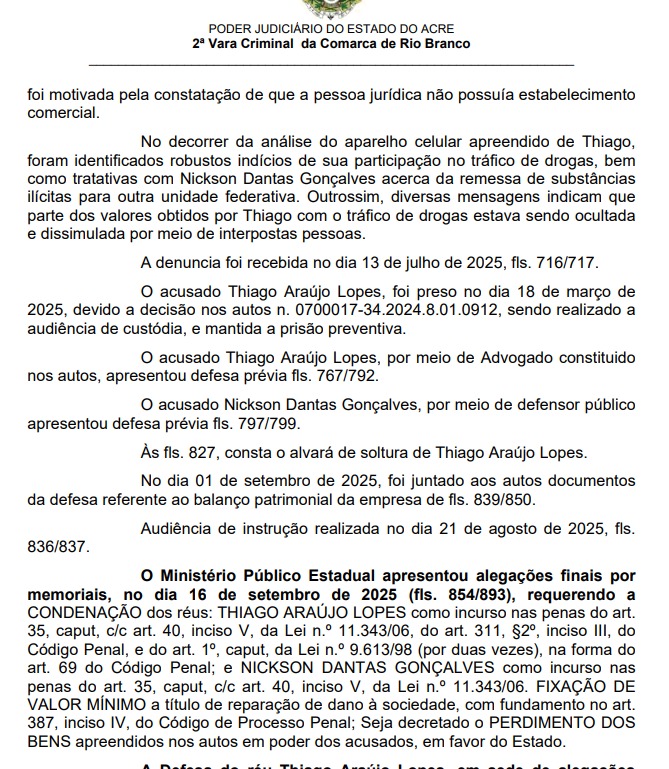 Em decisão proferida pelo juiz Flávio Mariano Mundin, da Vara de Delitos de Drogas e Organização Criminosa, a Justiça do Acre selou o destino de Thiago Araújo Lopes e Nickson Dantas Gonçalves,  apontados como líderes de uma organização criminosa que fazia  remessa de entorpecentes para outros estados e a ocultação de patrimônio através de “laranjas”.