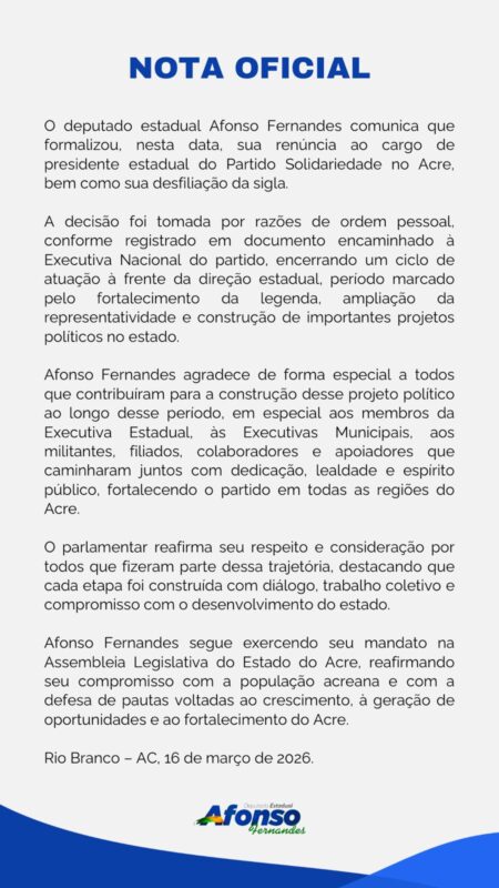 Nos bastidores, a saída de Afonso Fernandes é interpretada como um divisor de águas dentro do Solidariedade no estado. Considerado um dos principais responsáveis pela expansão da sigla no interior, o parlamentar construiu uma base política sólida ao atrair lideranças locais e fortalecer diretórios municipais, ampliando a capilaridade do partido em diversas regiões do Acre.