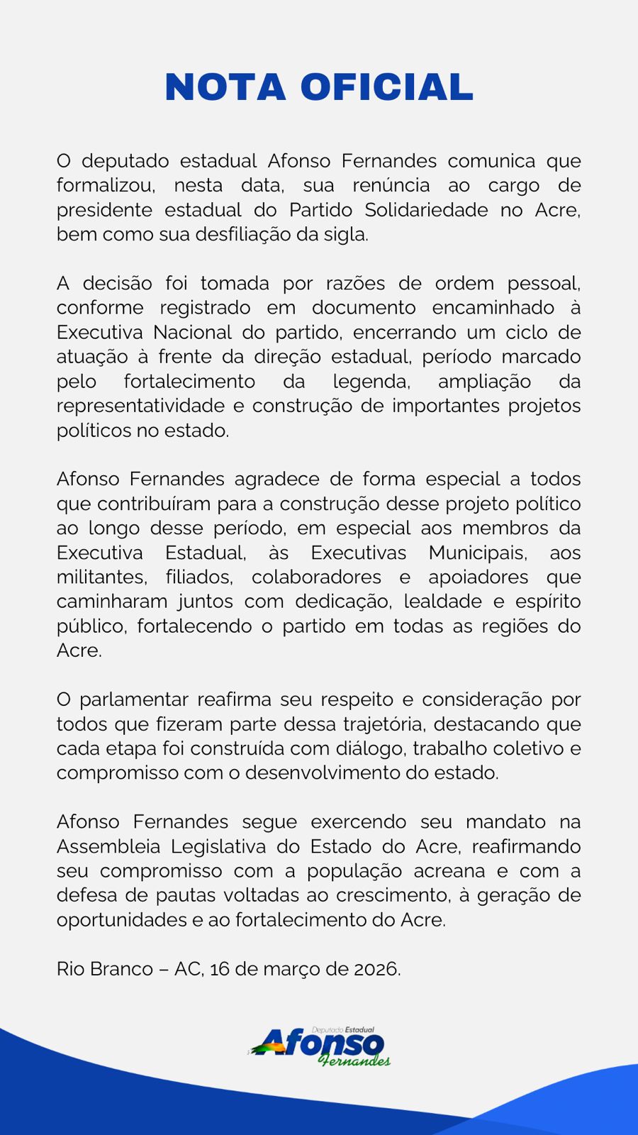 Mesmo deixando a presidência e a filiação partidária, Afonso Fernandes reafirma que continuará atuando na vida pública com o mesmo compromisso que marcou sua caminhada até aqui, defendendo os interesses da população e contribuindo para o desenvolvimento do Acre.