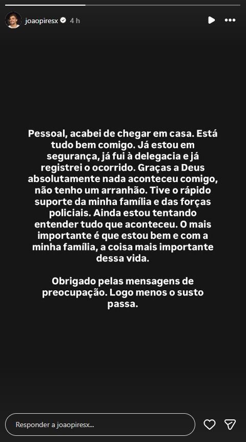 Após o episódio, João Pires informou pelas redes sociais que estava em casa e em segurança, e que recebeu apoio da família e das forças policiais. Ele também afirmou ter ido à delegacia para registrar a ocorrência e que ainda busca entender as circunstâncias do caso.