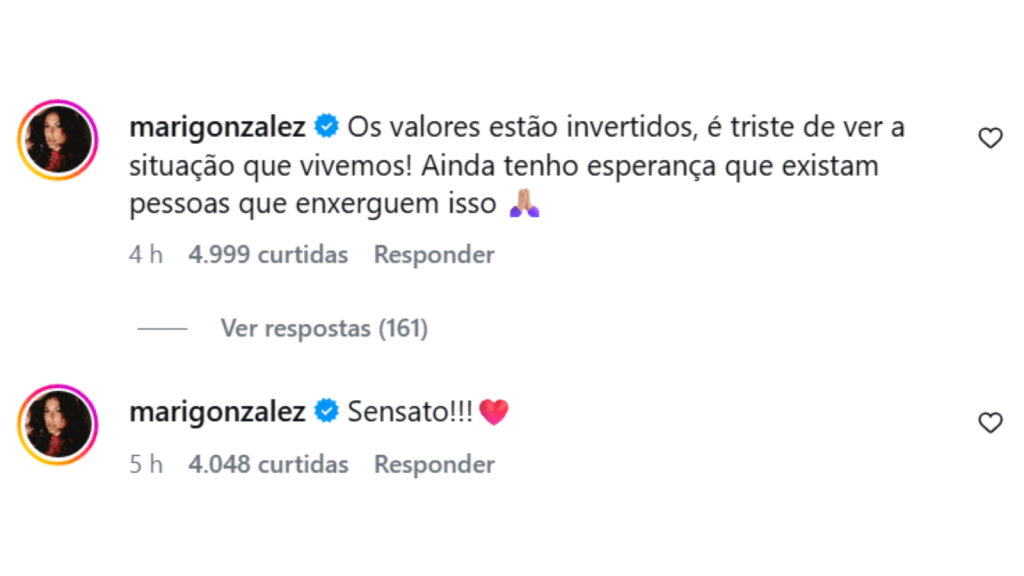 Na seção de comentários, Mari deixou duas contribuições apoiando o ex. Na primeira, ela citou: “Sensato!!!”. “Os valores estão invertidos, é triste ver a situação que vivemos! Ainda tenho esperança de que existam pessoas que enxerguem isso”, completou na sequência.