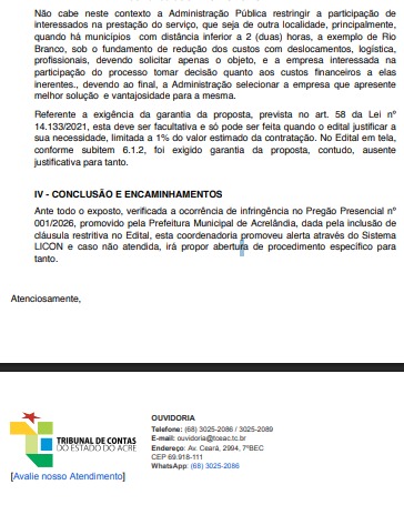 A irregularidade central apontada pelos auditores do tribunal diz respeito a uma cláusula considerada restritiva à competitividade. O edital exigia que as empresas participantes possuíssem sede ou filial no município de Acrelândia, sob a justificativa de eficiência na execução dos serviços, redução de custos logísticos e atendimento emergencial em eventos esportivos.