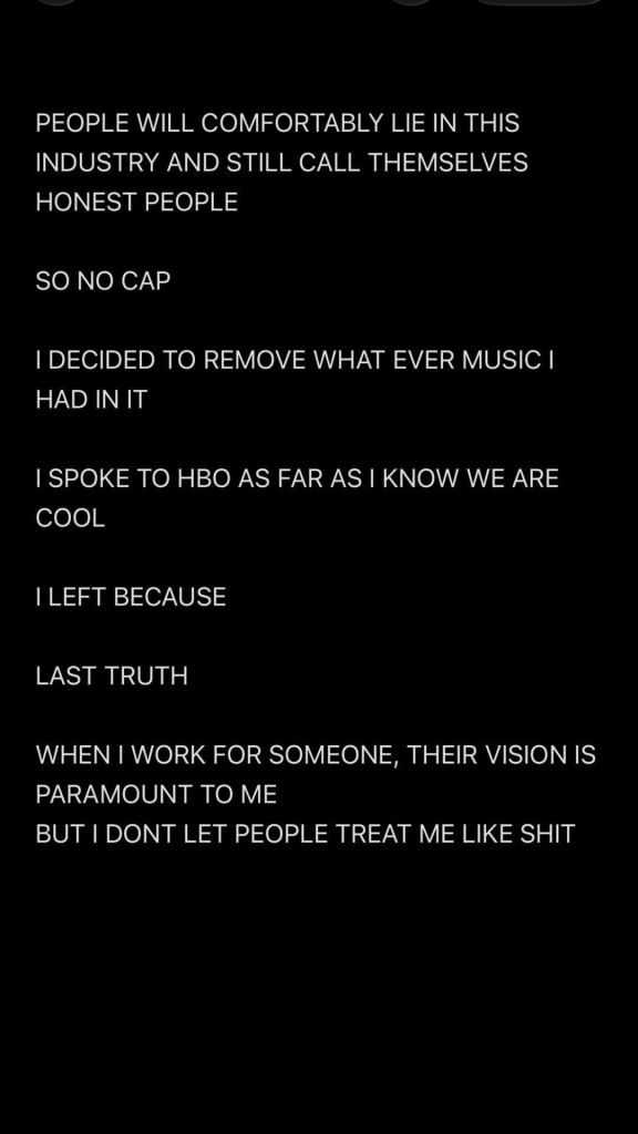 “As pessoas confortavelmente mentem nessa indústria e ainda se dizem honestas. Então, sem brincadeira, decidi remover qualquer música minha dela. Falei com a HBO, até onde sei, estamos de boa. Eu saí porque, de verdade, quando eu trabalho para alguém, a visão deles é o mais importante para mim, mas eu não deixo ninguém me tratar que nem m*”, escreveu Labrinth.