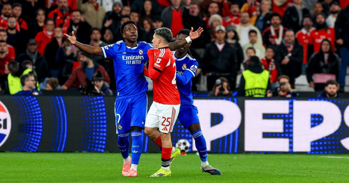 Gianluca Prestianni foi acusado por Vinicius Júnior de ter chamado o brasileiro de “macado” no jogo de ida, disputado no Estádio da Luz, em Lisboa. A transmissão da partida mostrou que o meia-atacante do Benfica encobriu a boca com a camisa durante o momento da discussão.